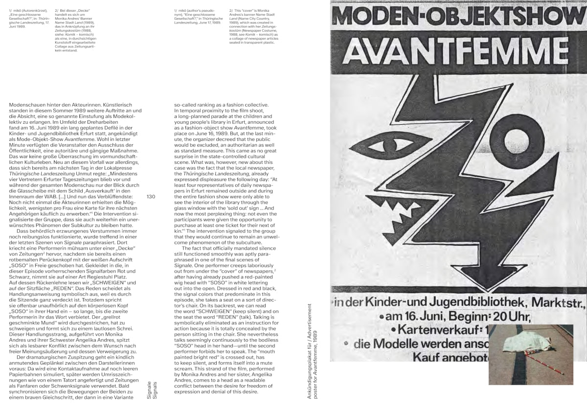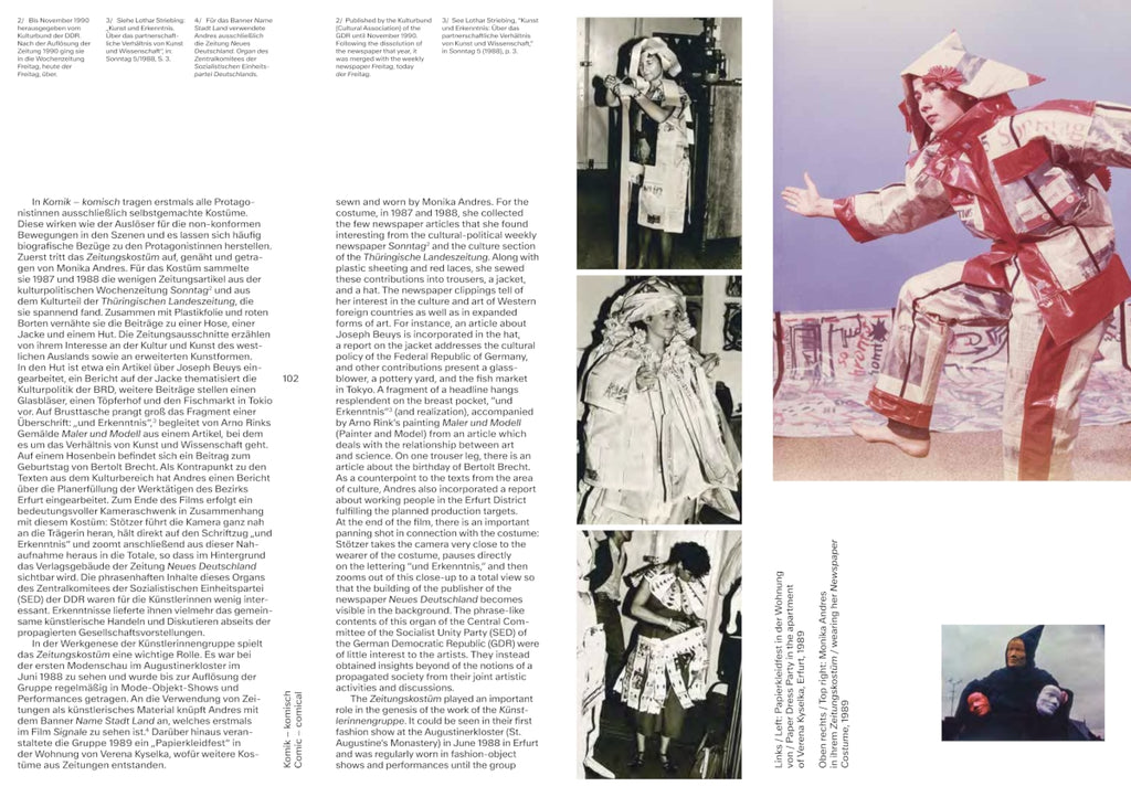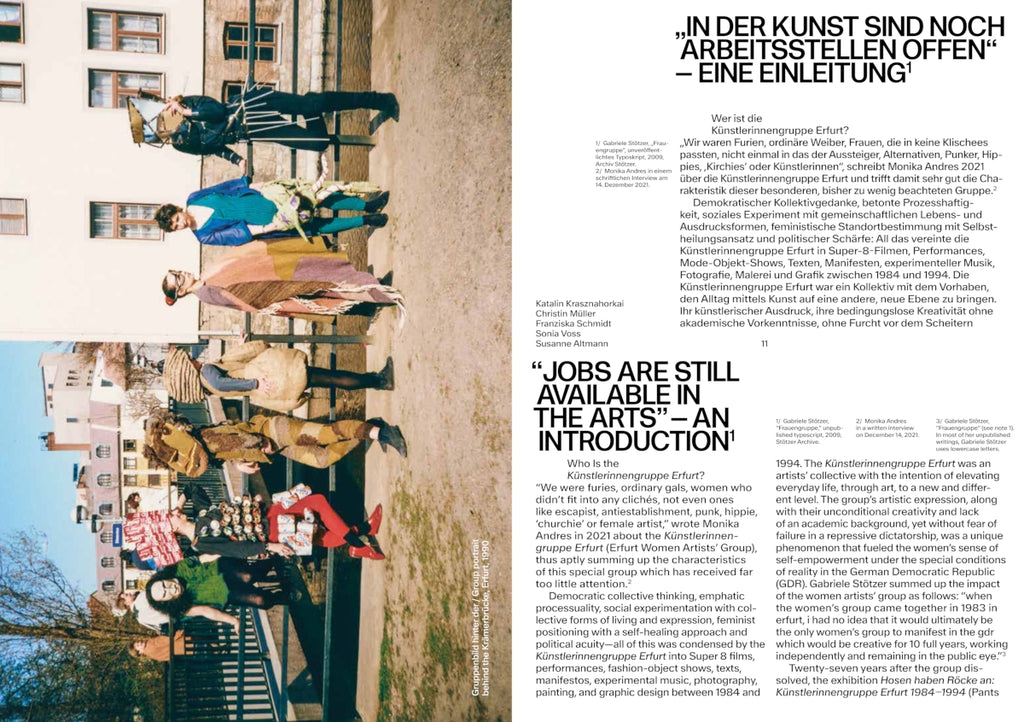 Founded in 1984 by women around Gabriele Stötzer, the Erfurt Women Artists' Group pursued a radically creative lifestyle to counter the rigid structures of everyday life in the GDR, over a period of ten years. Subversive, witty, borne of a liberating sense of defiance against normative gender roles, their artistic expressions provide an insight into the little-known feminist subculture in the GDR. Their pioneering role in terms of an exploration of female identity is particularly reflected through five experimental Super 8 films, subsequent live performances, and fashion-object shows. Often unfolding intuitively from sequences of audio, dance, and literary elements, self-created and provocative costumes that served as alter egos of the artists took center stage. Their political commitment culminated in December 1989 in the first occupation of a Stasi, State Security Service, headquarters, initiated by five women, three of whom were part of the group.