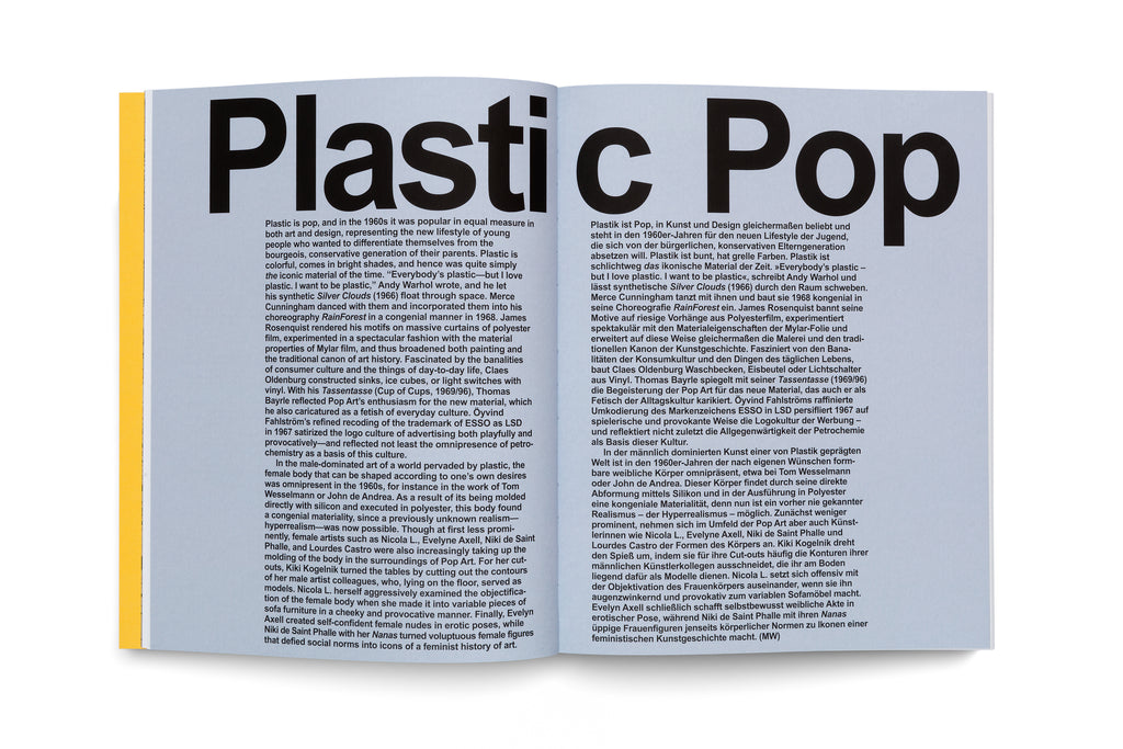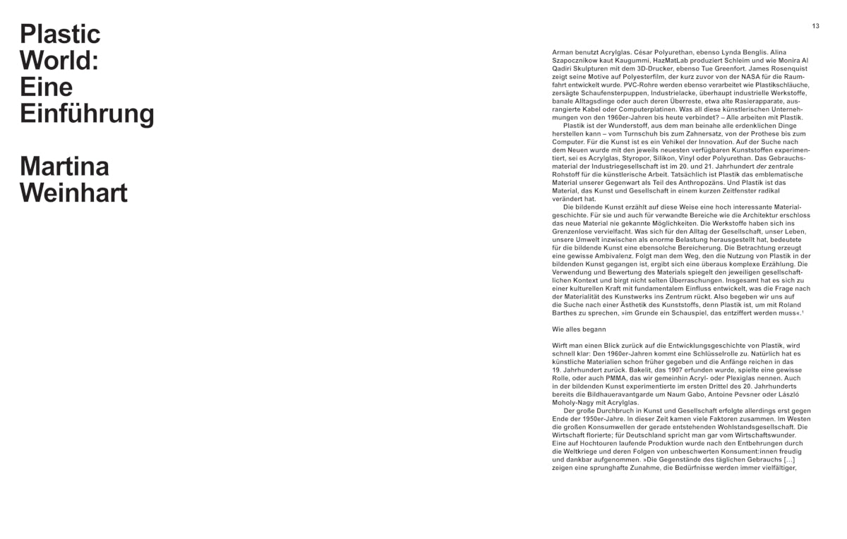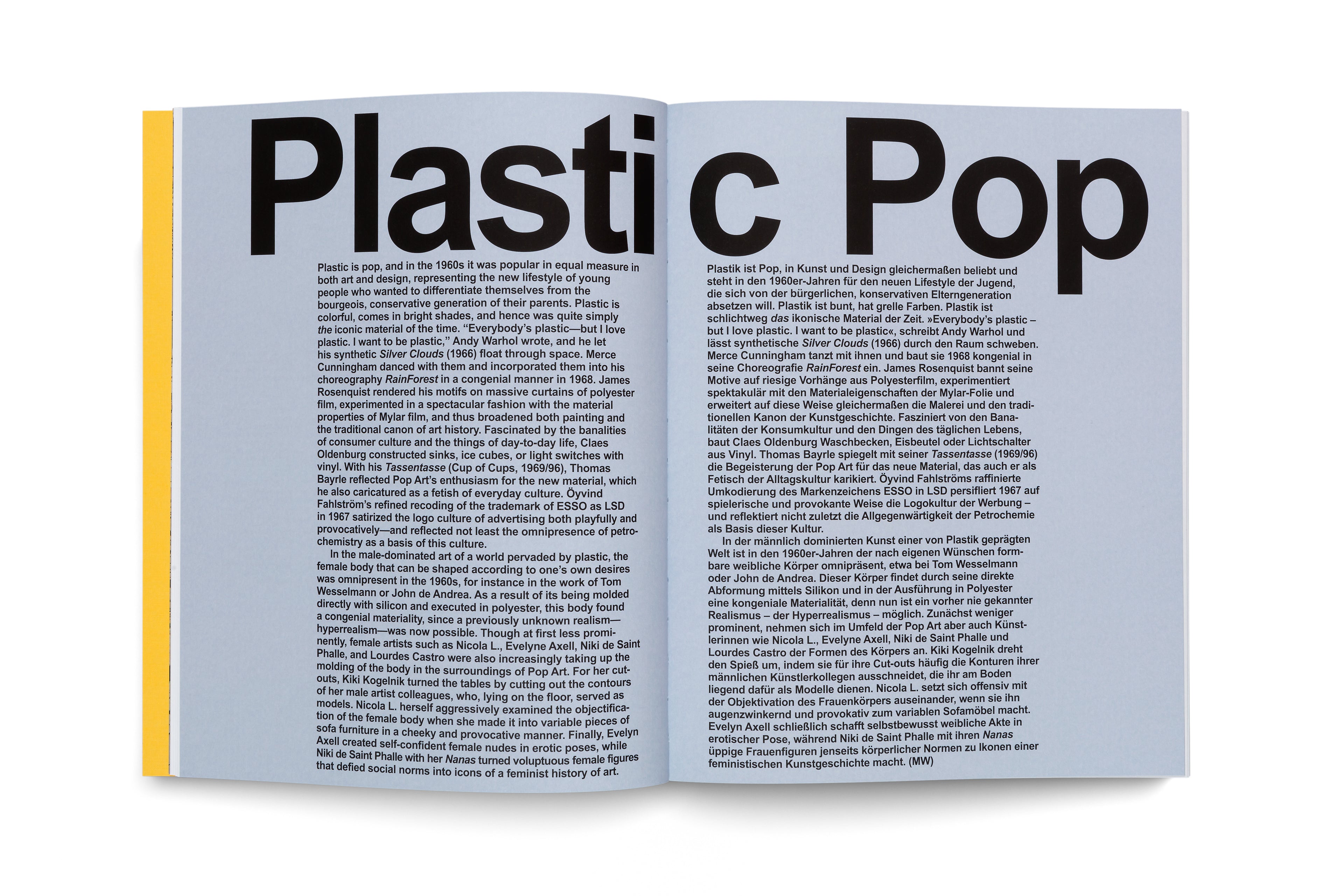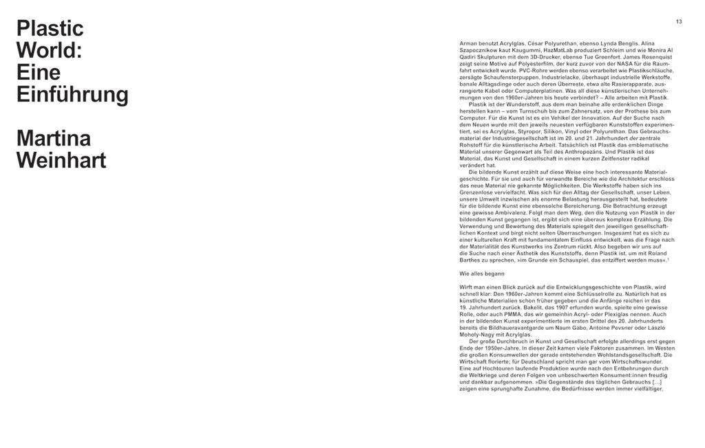 Plastic is everywhere. It permeates our everyday lives, is inexpensive and available worldwide. Thanks to their literally astonishing plasticity, plastics soon began to fascinate artists as well—both as a symptom and a symbol of mass culture. In the brief history of the "Plastic Age" the versatile substance transformed though: from the epitome of progress, utopian spirit, and democratization of consumerism into a threat. Plastic World offers a broad panorama of the artistic use of plastic and a position towards a matter that matters to us all. Through more than 100 objects, assemblages, installations, environments and films by some 50 international artists, this catalogue explores a spectrum ranging from the euphoria of pop culture in the 1960s and the futuristic influence of the space age, to the "trash" works of Nouveau Réalisme and the ecocritical positions of today.