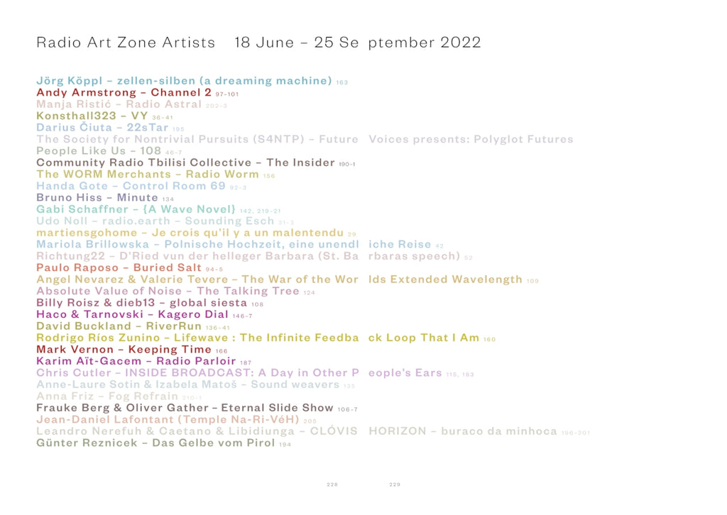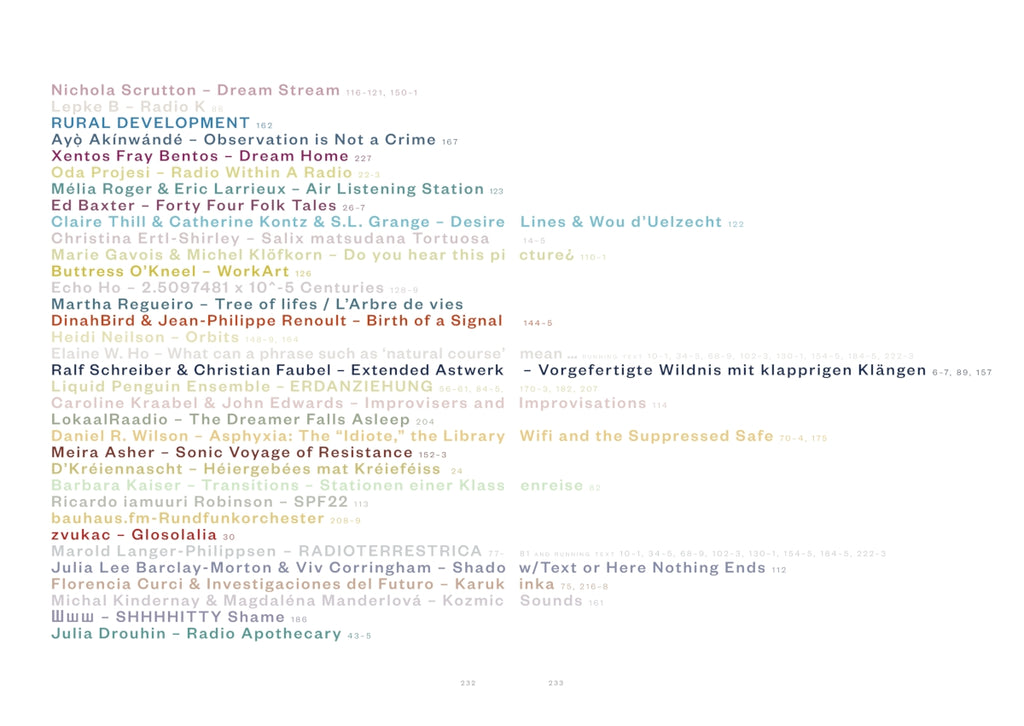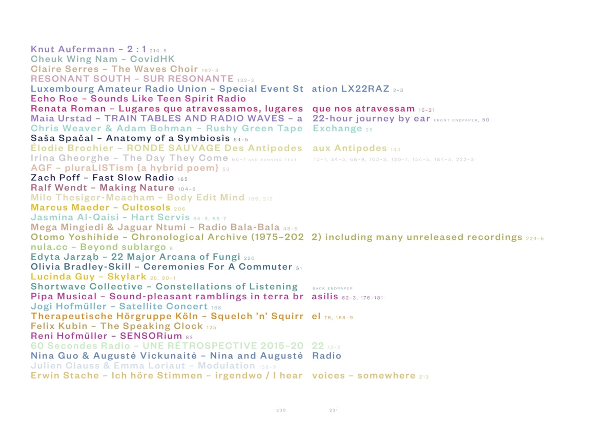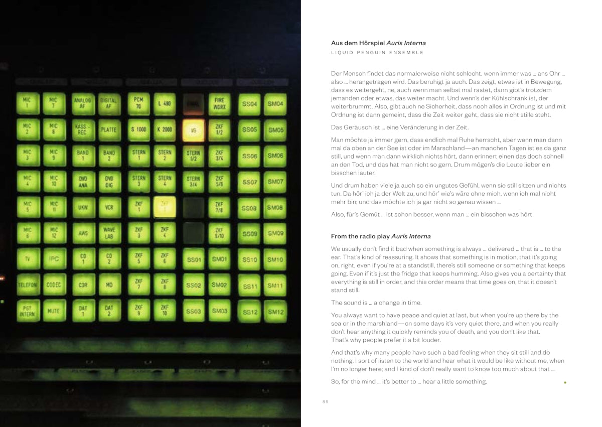 Texts by: Jasmina Al-Qaisi, Knut Aufermann, Ed Baxter, Frauke Berg, Élodie Brochier, Irina Gheorghe, Lucinda Guy, Elaine W. Ho, Catherine Kontz, Caroline Kraabel, Felix Kubin, Marold Langer-Philippsen, Liquid Penguin Ensemble, Heidi Neilson, Buttress O'Kneel, Tomáš Procházka, Ralf Schreiber, Nichola Scrutton, Sisters Akousmatica, Erwin Stache, Ralf Wendt, Daniel R. Wilson