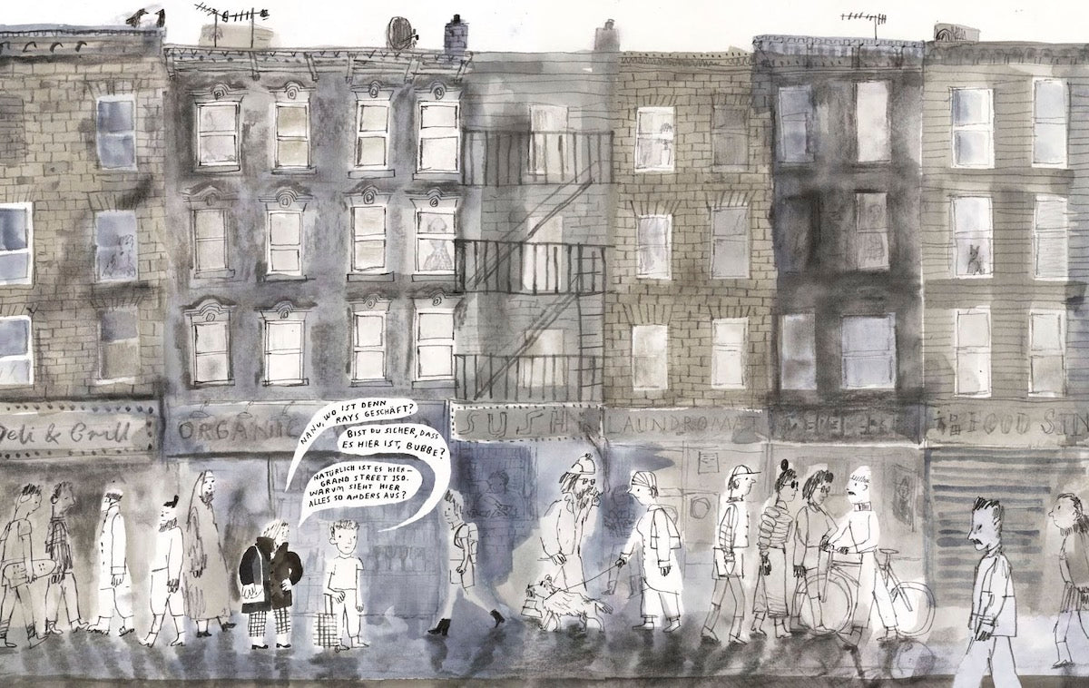 A watercolor and ink illustration of a bustling city street lined with grey brick apartment buildings. A diverse crowd of people walks along the sidewalk in front of storefronts for a deli, sushi restaurant, and laundromat. In the foreground, a boy and an older woman are talking, with their dialogue written in German inside speech bubbles.