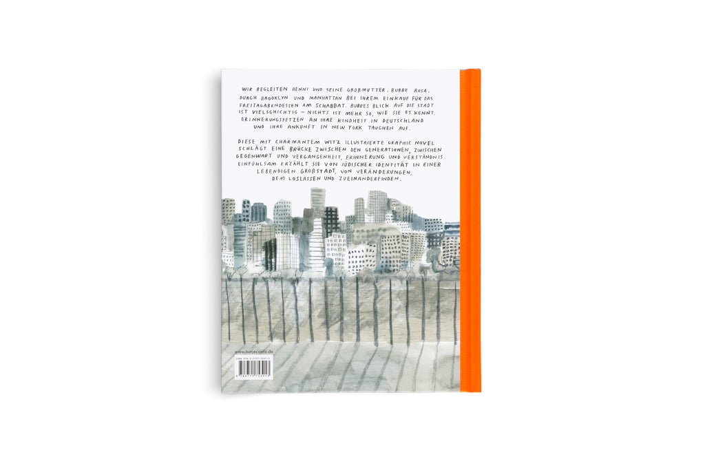 This very sensitive and seemingly simple story tells of Jewish identity in a vibrant, big city; at the same time, it is about change, letting go, and finding each other. Bubbe Rosa's relationship to the city is complex—nothing is as she remembers it, and she looks grimly at the world around her. Through little Benni's open, kindly gaze, the city and his grandmother seem very different. As they walk, snippets of Bubbe's memories of her childhood in Germany and her arrival in nineteen-fifties' Brooklyn come to light. Piece by piece, a picture of Bubbe's life emerges from the scraps of memory, explaining why she is so grumpy. The story culminates in a reunion with her first love, Gershon the baker. On their way home to dinner, Bubbe Rosa and her grandson Benni find a new and wonderful approach to each other's lives and the opportunity to talk about them.