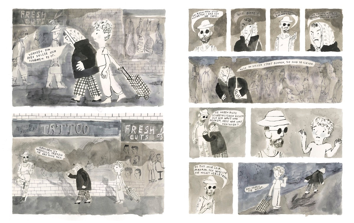A two-page comic strip in a grayscale watercolor style with German text. An older person in a headscarf and a younger person with a shopping cart walk down a city street. They have a tense confrontation with a tattooed man using a vape, which unfolds over several panels. The encounter ends with the older person walking away.