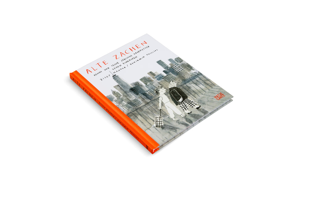 A hardcover book titled Alte Zachen, with a bright orange spine, resting on a white surface. The cover features a sketched illustration of a boy and an older woman walking through a gray, stylized cityscape. The boy pulls a rolling shopping basket.