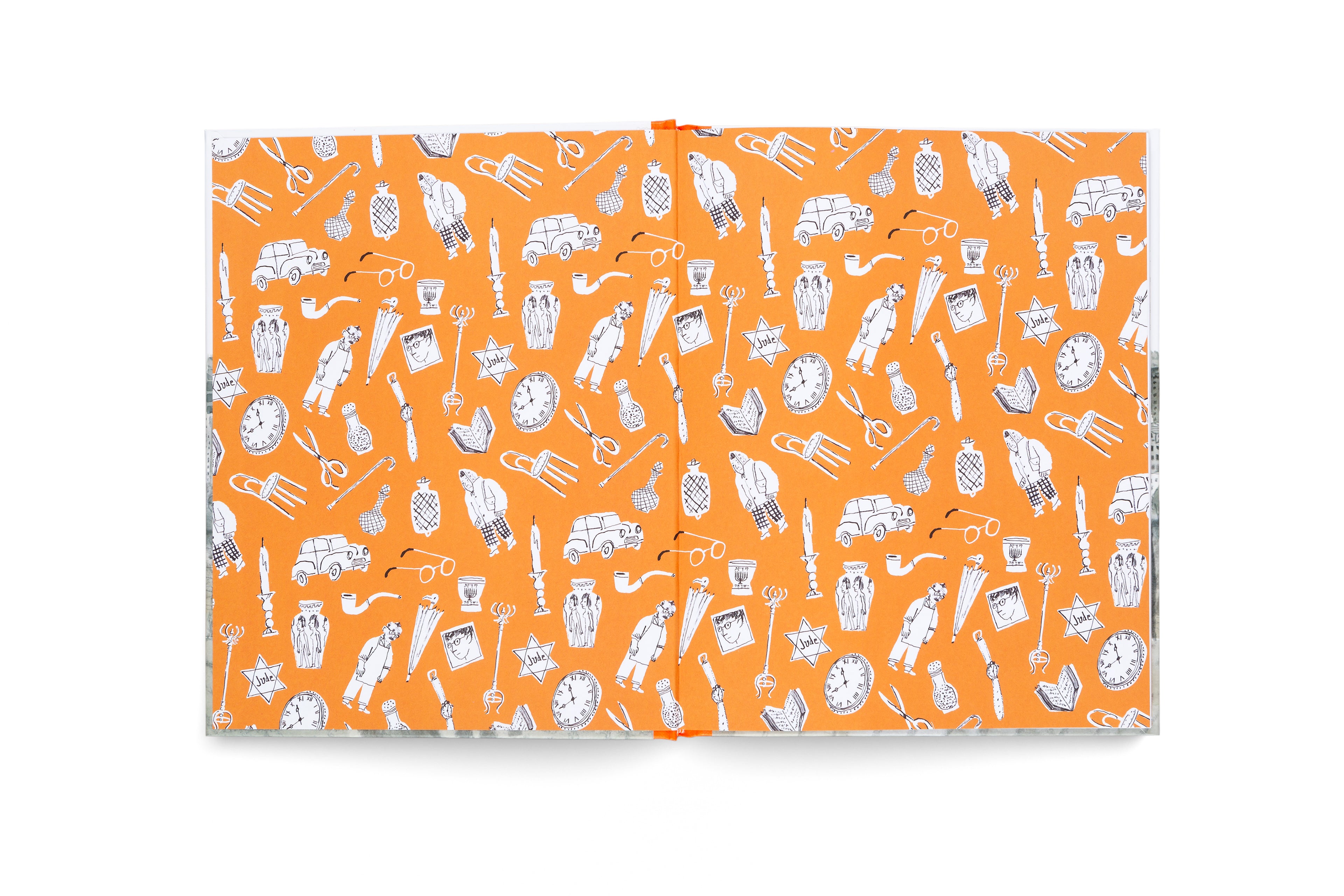 An open book laid flat reveals illustrated endpapers with a vibrant orange background. A repeating pattern of black-and-white line drawings covers the pages, featuring whimsical illustrations of people, vintage cars, clocks, scissors, eyeglasses, and symbols of Judaica, including a Star of David with the word Jude.
