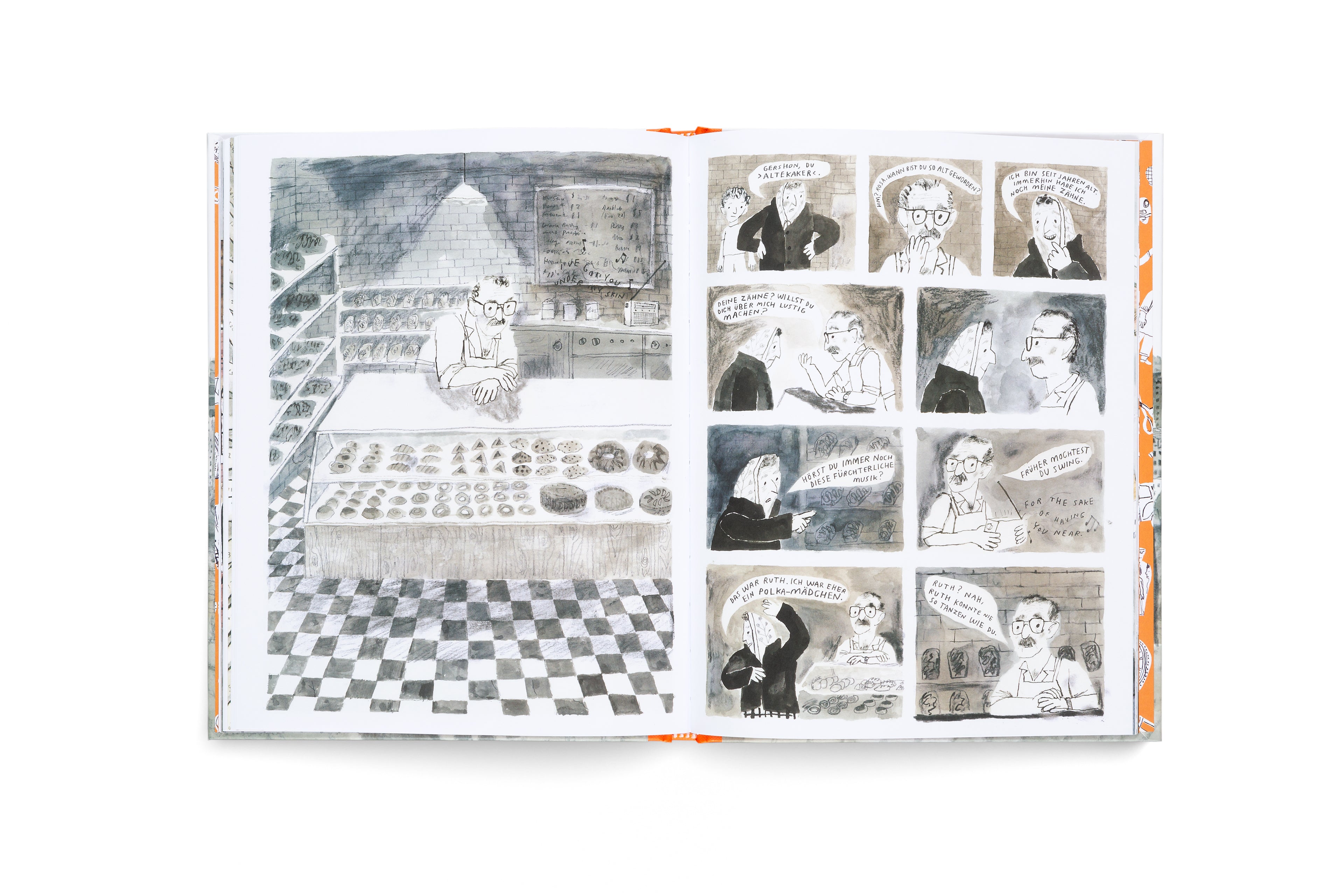 An open book showing a two-page comic spread illustrated in black and white ink wash. The left page is a large panel of a baker with glasses standing behind a pastry counter in a shop with a checkered floor. The right page is a grid of smaller panels detailing a conversation in German between two people.