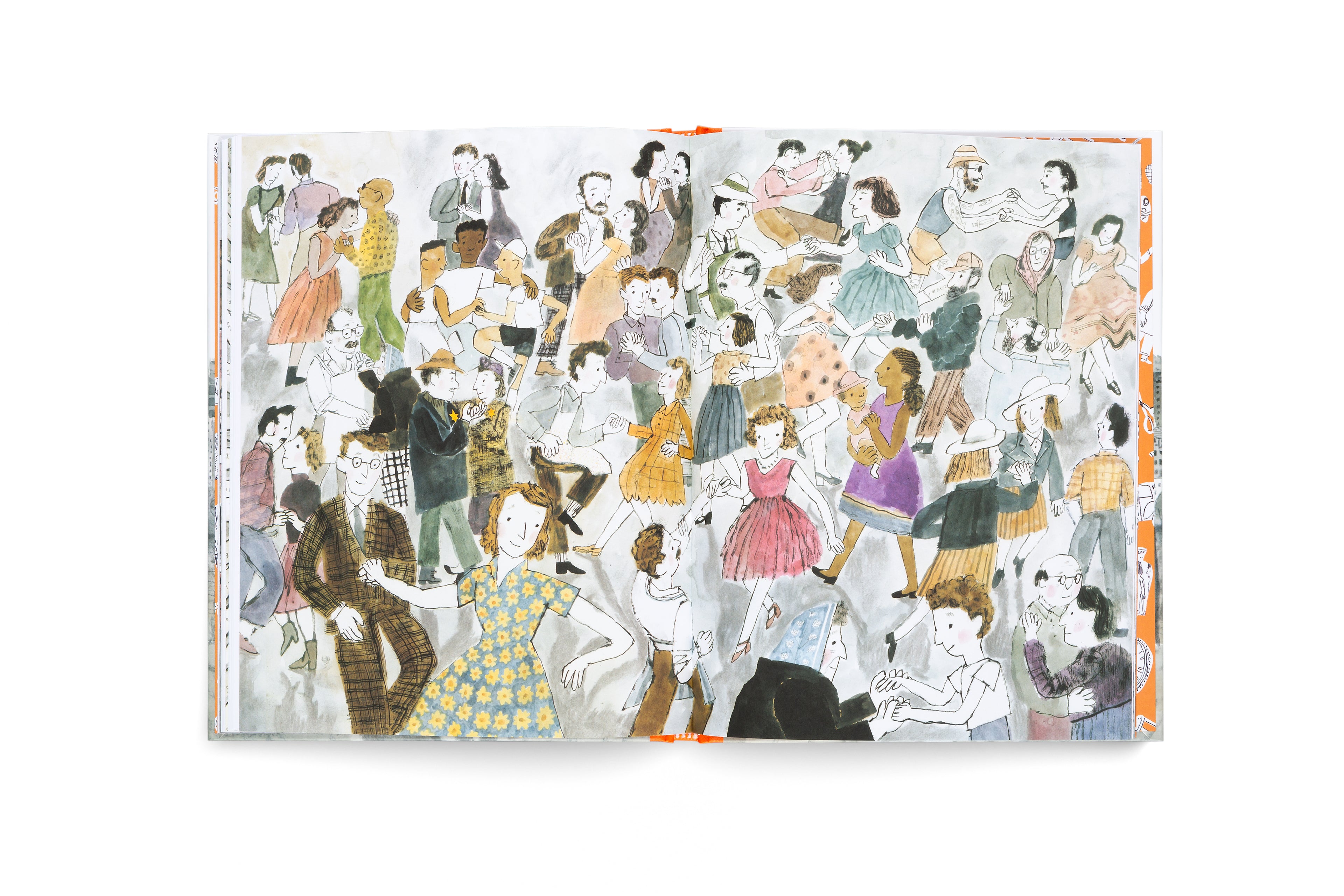 An open book on a white surface shows a full-spread watercolor illustration of a crowded dance floor. The scene is filled with a diverse group of people of various ages and ethnicities, all joyfully dancing together in couples and small groups.