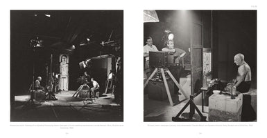 A black and white diptych showing behind-the-scenes photographs from the filming of Le Mystère Picasso in 1955. The left image is a wide shot of the studio, showing a shirtless Pablo Picasso seated and working, surrounded by film crew, cameras, and lights. The right image is a closer shot of director Henri-Georges Clouzot and a cameraman filming Picasso as he creates a drawing.