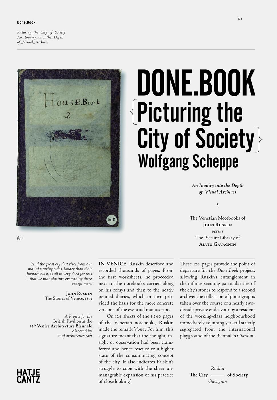 In his project Migropolis, Wolfgang Scheppe dealt with Venice as a prototype for the escalation of the globalized city. Now, in this visual study, the German philosopher, who lives and teaches in Venice, has turned to this city yet again for an investigation into the means and scale of representation for the purpose of discovering how its image archives can enable understanding its social character. In this conceptual work, entitled Done.Book, he relates two obsessive attempts at archiving Venice: John Ruskin's notebooks and the never-before-seen collection of photographs taken by a resident of the city's working-class district adjacent to the Biennale's Giardini. Both evince the conviction that the cognitive quality of the image is a means of acquiring insight, and both also stem from a self-imposed ethical commitment to provide a comprehensive representation of the details of an urban network whose truth can be glimpsed in the minutiae, the hidden details.