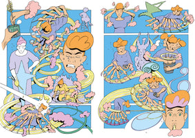 A colorful and surreal two-page comic spread with a bright blue background. Winding yellow ribbons with pink clouds flow through every panel, connecting chaotic scenes. These include a person painting a large star, another tumbling through the air, a close-up of a crying face, and a recurring figure with many spider-like limbs performing various tasks like stirring a bucket. The final panel shows a face blowing a pink cloud from its mouth.